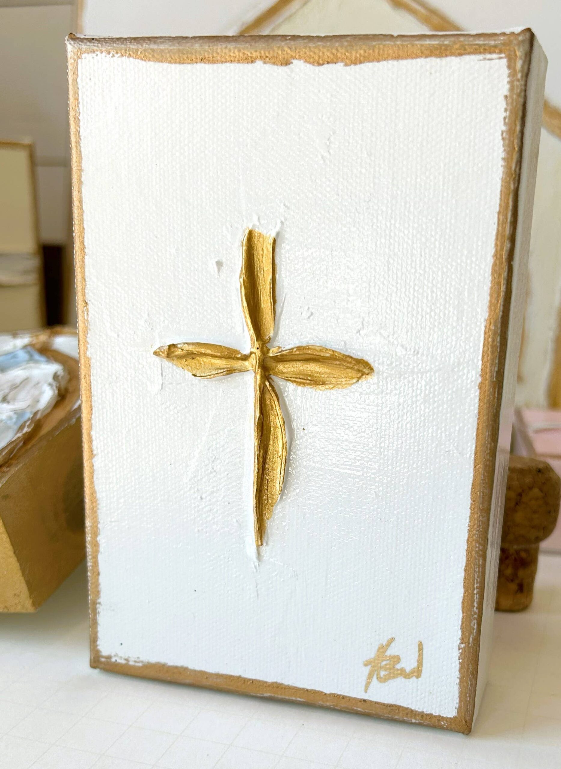This simple, elegant cross is set daintily on a thick 4×6-inch wood block or gallery canvas. Cross is textured and hand painted in a luxurious gold, and edges are rubbed with rich gold accents.