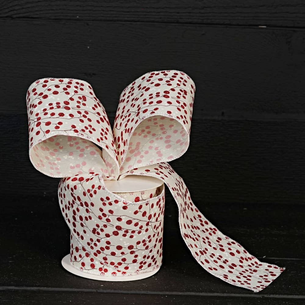 (NEW 2024 ITEM!) 'Tis the season, so be sure to add our Wired Ribbon (4inWx10yd)-Cream Burlap with Red Berries to your Christmas holiday decorations!