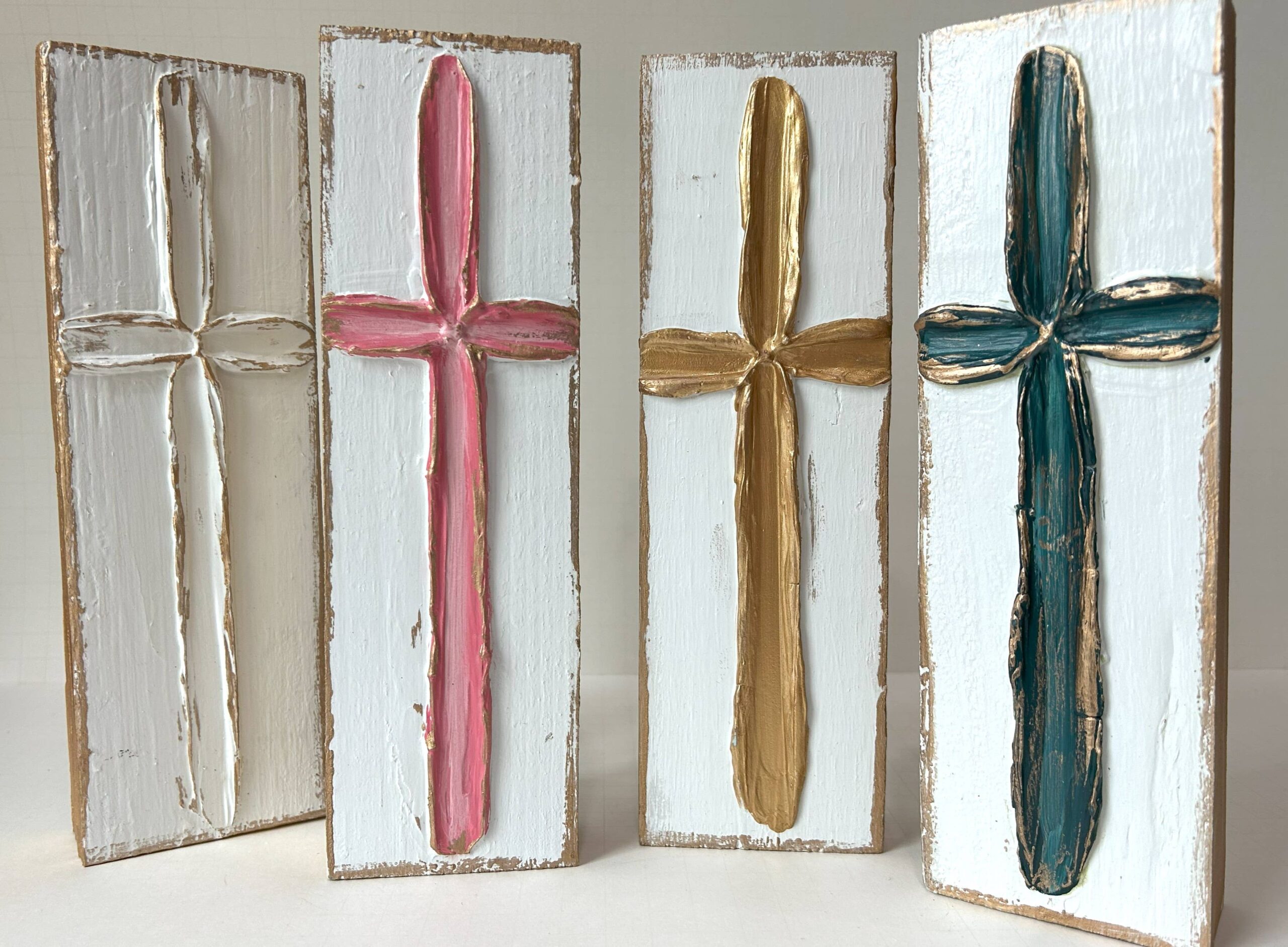 This elegant cross is beautifully hand painted and textured on a thick, self-standing 3×10 wood block. Background is white with the cross available in 4 color options: white, gold, coral, or emerald.